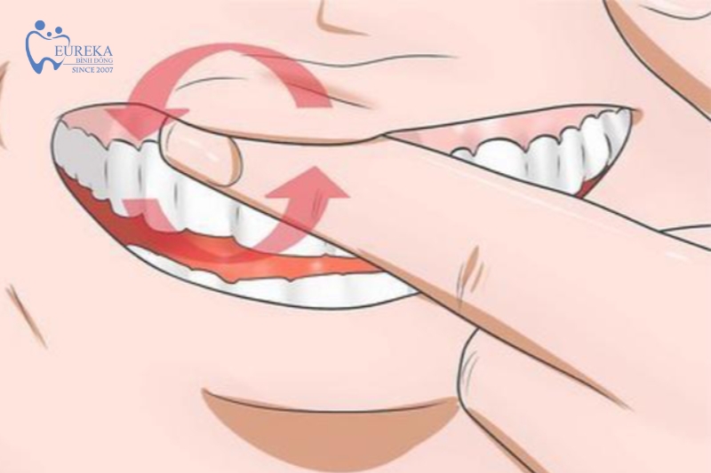 - Đóng hàm lại sao cho răng cửa trên và dưới chạm nhau, sau đó đẩy hàm về phía trước để tạo áp lực lên nướu.